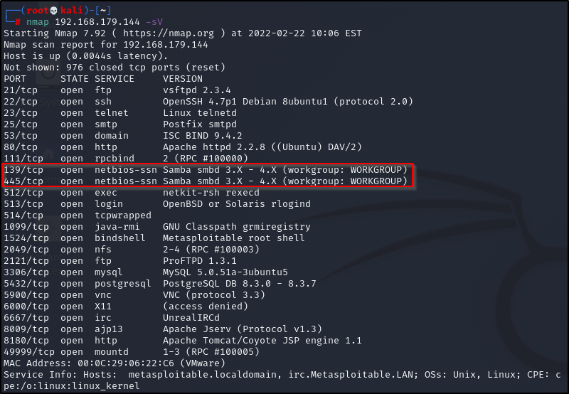 The screenshot below shows the results of running an Nmap scan on the Metasploitable 2 virtual machine. From the results, we can see that ports 139 and 445 are open. The version range appears to be somewhere is somewhere between 3 and 4, but the exact version of Samba running on those ports is unknown.