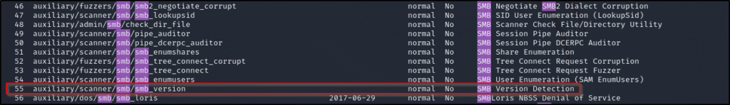 Since the protocol running on these ports is SMB, we can search Metasploit’s auxiliary modules for SMB-related scanners. In msfconsole, run the following command: