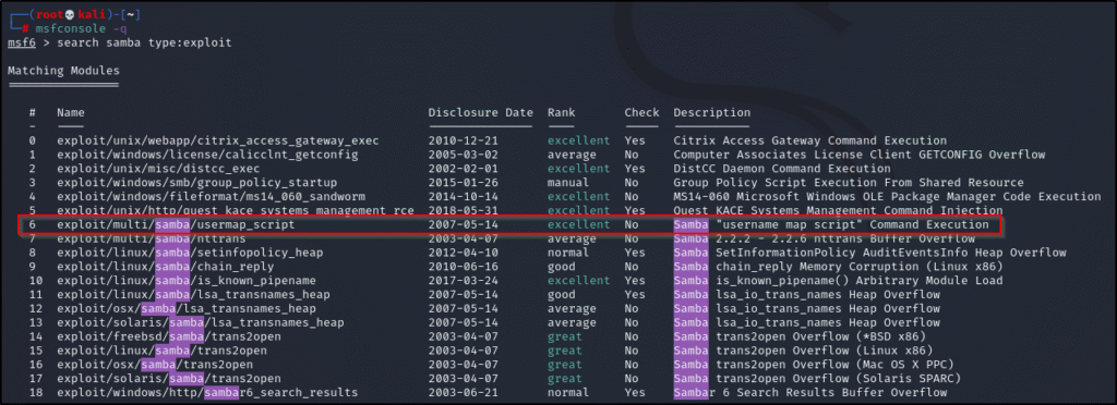 Running a search on searchsploit for Samba exploits returns a long list of potential options. A snippet of those results is shown below: